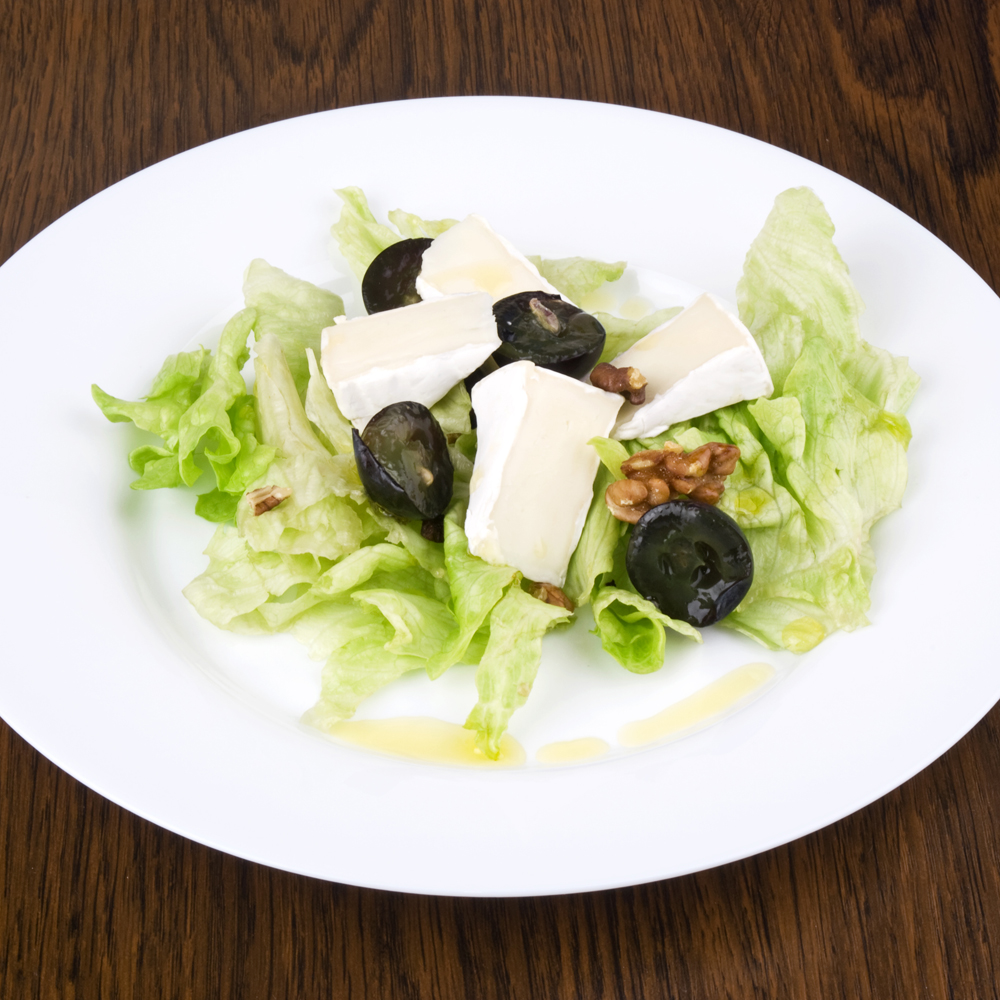 Den Salat mit dem Dressing mischen, auf Tellern verteilen und Camembert sowie Trauben darüber geben.