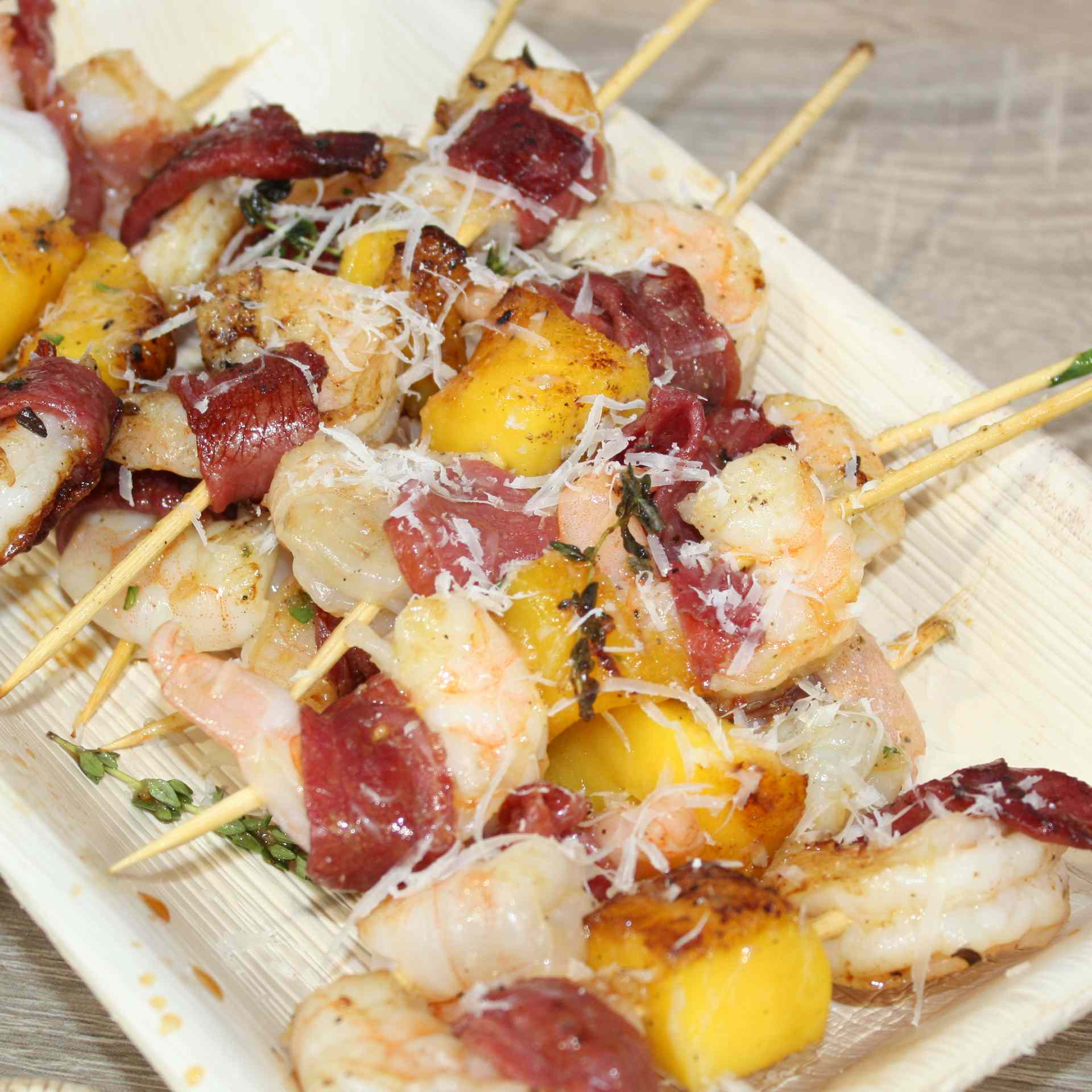 Für die Spieße Scampi putzen, abspülen und trocken tupfen. Scampi und Marinade mischen. Scampi etwa 30 Min. marinieren. Mangofleisch vom Stein schneiden, schälen und in dünne, halbrunde Scheiben schneiden. Scampi aus der Marinade nehmen und jeweils in eine Scheibe Bresaola wickeln. Pro Spieß 2 Scampi und 3 Stücke Mango abwechselnd aufspießen. Öl in einer Pfanne erhitzen. Spieße portionsweise von jeder Seite etwa 2-3 Min. braten. Dabei mit der Marinade begießen.
