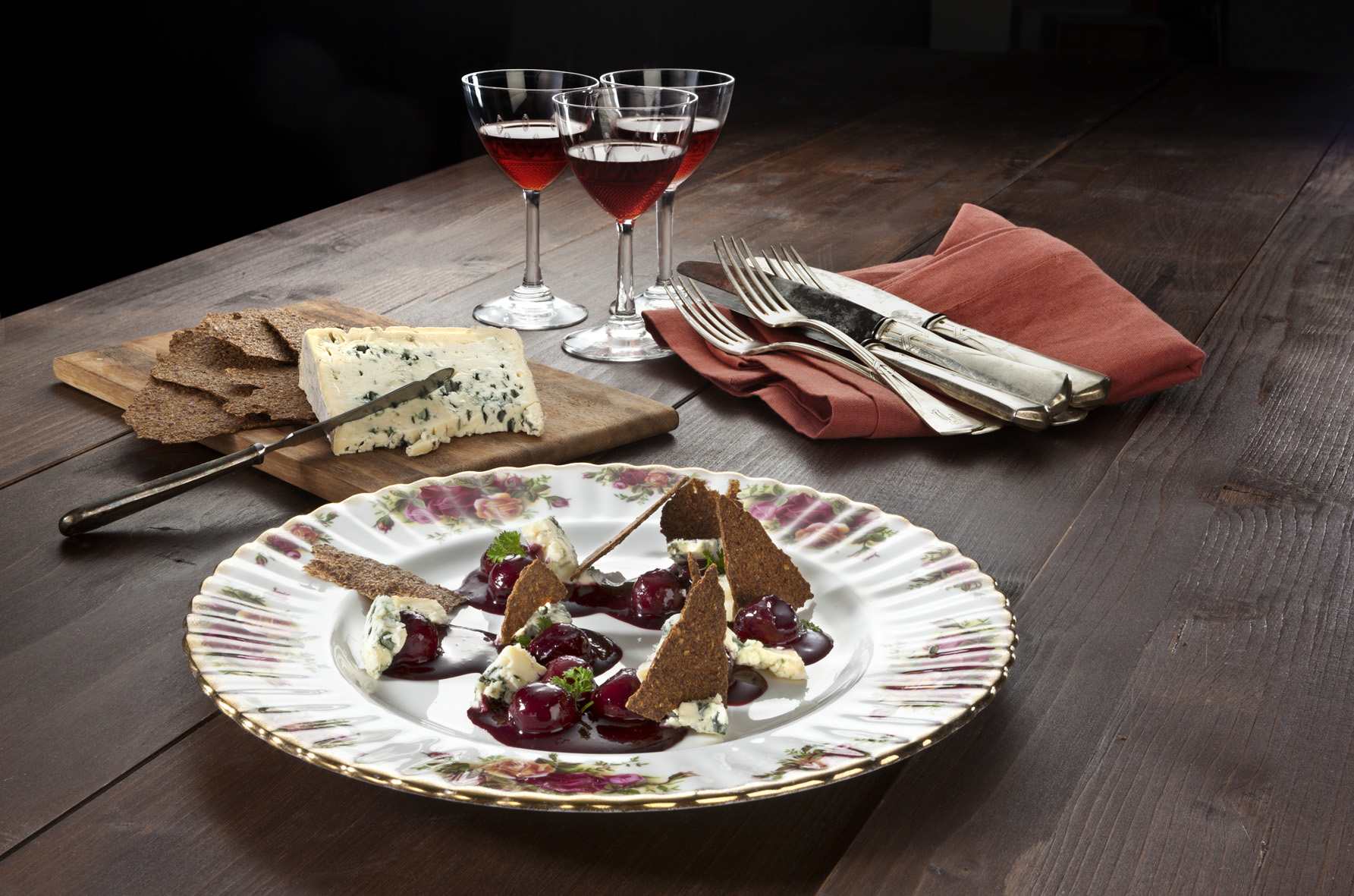 Balsamico-Kirschen mit Leinsamen-Cracker und Bleu d`Auvergne